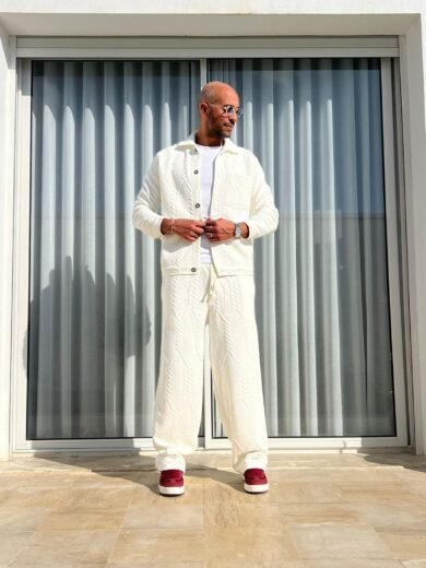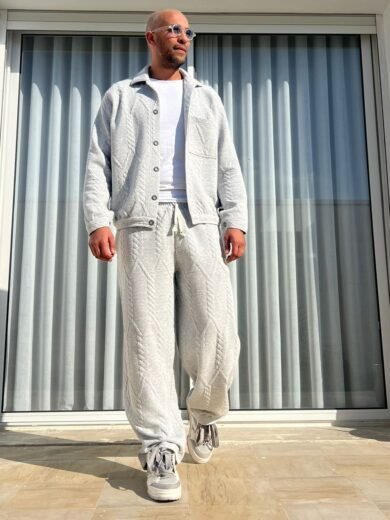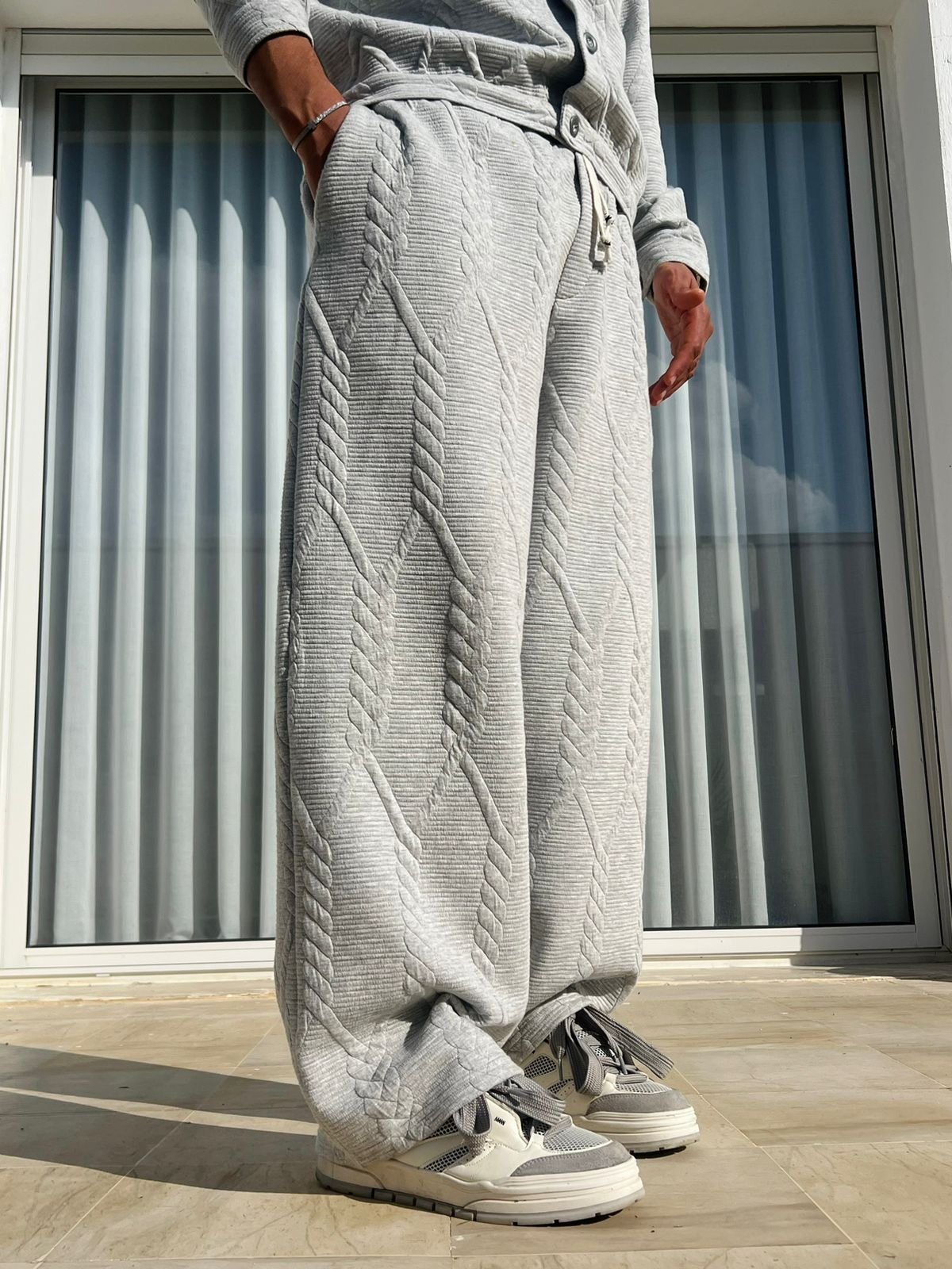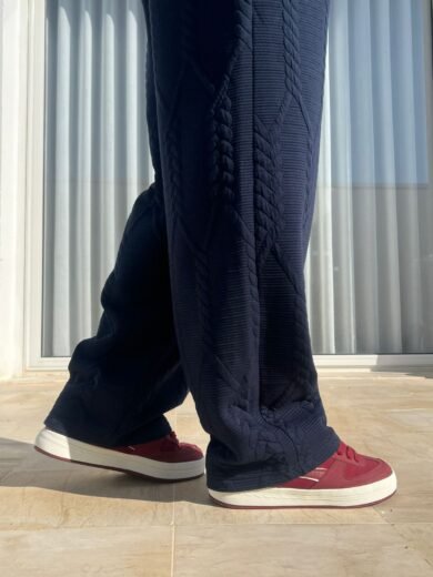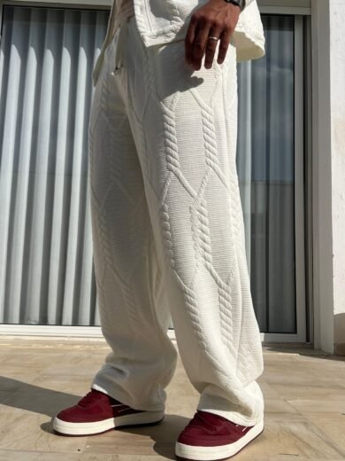 Ce pantalon large séduit par son molleton épais à motif torsadé, alliant confort et style contemporain. Sa coupe ample offre une silhouette fluide et moderne, idéale pour un look casual chic.